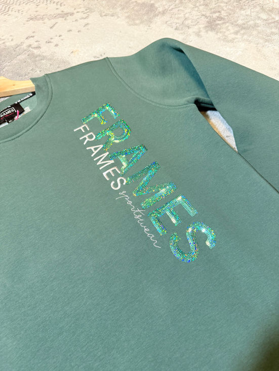 Ein besonderes Highlight ist der glitzernde Pailletten-Schriftzug auf der Vorderseite, kombiniert mit feiner Stickerei. Auf der Rückseite setzt eine dezente „FRAMES“-Paillettenstickerei unter dem Kragen ein elegantes Signature-Detail – feminin, hochwertig und absolut stilvoll.