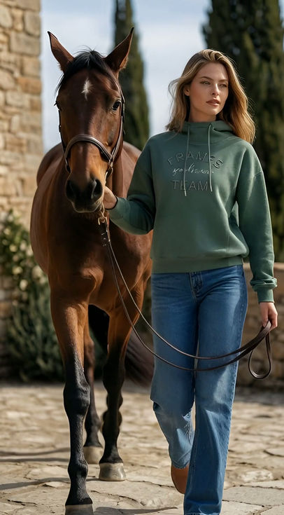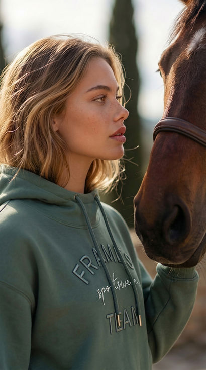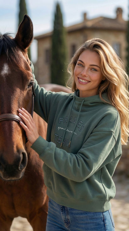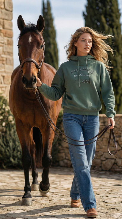 Der hochwertige Stoff (ca. 290 g, 70 % Baumwolle / 30 % Polyester) besitzt eine soft-cozy Innenseite, die angenehm wärmt und sich unglaublich weich anfühlt. Ein Gefühl, das du beim Reiten, im Stall oder unterwegs sofort spürst – leicht, gemütlich und trotzdem edel.