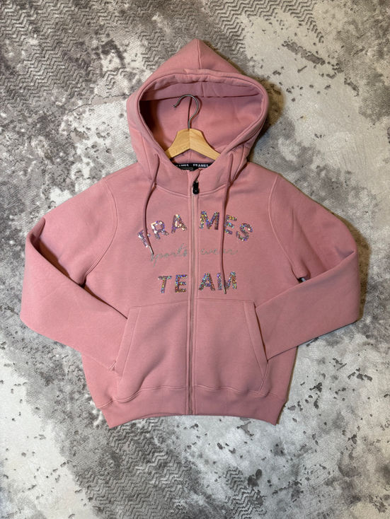 Auch die Kapuze ist ein Statement: Der glitzernde „FRAMES“-Pailletten-Schriftzug macht sie zum exklusiven Signature-Element und unterstreicht die hochwertige Ästhetik der Sweatjacket.