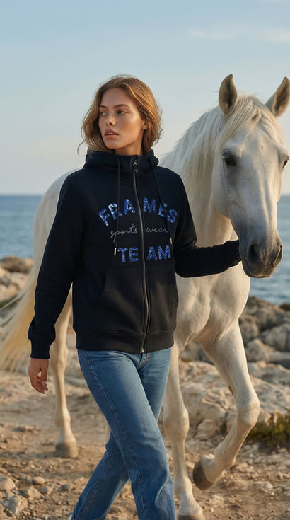 Auch die Kapuze ist ein Statement: Der glitzernde „FRAMES“-Pailletten-Schriftzug macht sie zum exklusiven Signature-Element und unterstreicht die hochwertige Ästhetik der Sweatjacket.