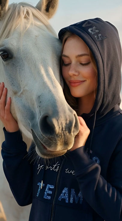Der hochwertige Stoff (ca. 290 g, 70 % Baumwolle / 30 % Polyester) besitzt eine soft-cozy Innenseite, die angenehm wärmt und sich unglaublich weich anfühlt. Ein Gefühl, das du sofort spürst – im Stall, beim Training oder unterwegs. Leicht, gemütlich und trotzdem edel.