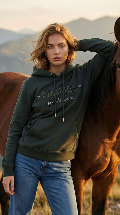 Auch die Kapuze trägt ein hochwertiges Detail: Hinten ist sie mit einem weiteren Ton-in-Ton „FRAMES“-Schriftzug bestickt, der den modernen Look harmonisch abrundet. Die dekorativen Kordeln unterstreichen den sportlichen Charakter des Hoodies.
